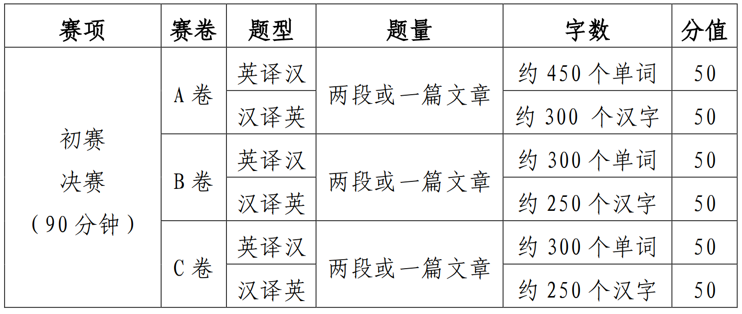 初赛和决赛均采取纸质赛卷笔试形式,题型为英汉互译。
