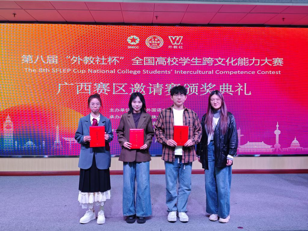 2025年第八届“外教社杯”全国高校学生跨文化能力大赛广西赛区邀请赛复赛与决赛阶段于11月22日顺利完成,同日颁奖典礼圆满结束,我校队伍喜获区赛二等奖。本赛事是入选教育部中国高等教育学会《2023 全国普通高校大学生竞赛分析报告》竞赛目录的重要外语能力赛事(参见https://rank.moocollege.com/newsdetail?id=3243)。