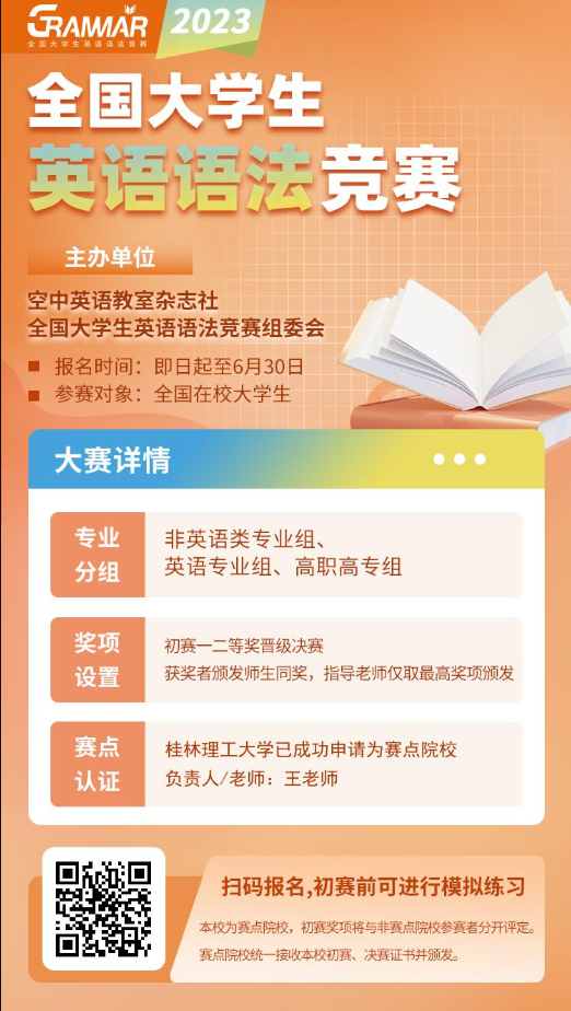 为贯彻落实教育部《乐鱼网页版页面登录加快建设高水平本科教育全面提高人才培养能力的意见》等文件精神,激发大学生学习英语的兴趣,增加英语语法知识的储备量,促进学生英语能力发展,为全国在校大学生提供展示英语语法水平和能力运用的舞台,特举办2023年全国大学生英语语法竞赛(以下简称“竞赛”)。桂林理工大学为赛点院校,现将大赛相关事宜通知如下: