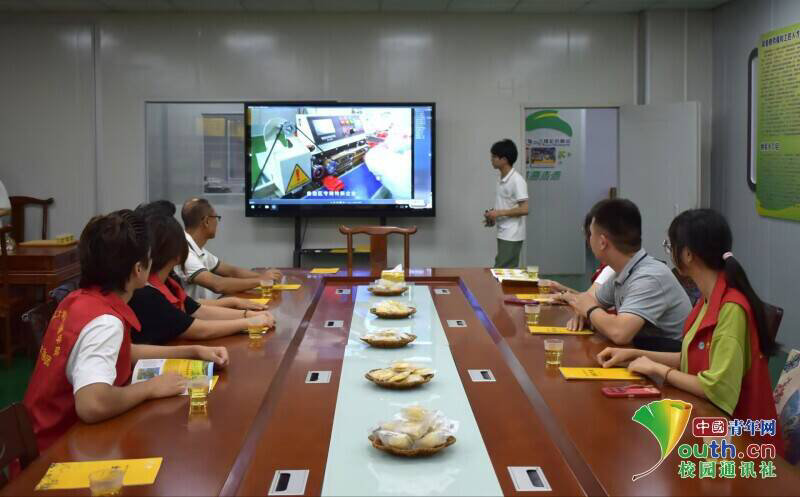 图为实践团成员在会议室观看与金槐有关的宣传片