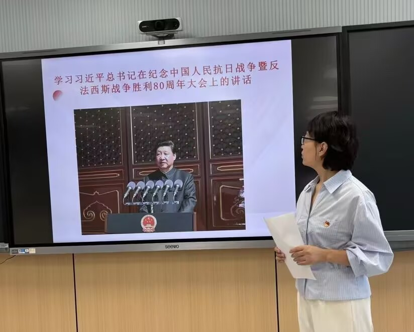 随后,支部播放2025年9月3日天安门阅兵精选片段,重温伟大时刻。当战旗方队护卫着“抗战先锋”红旗通过荧屏时,现场响起热烈掌声。教师蒋红英感慨:“何其有幸,生在中国这片安全感满满的大地上。”
