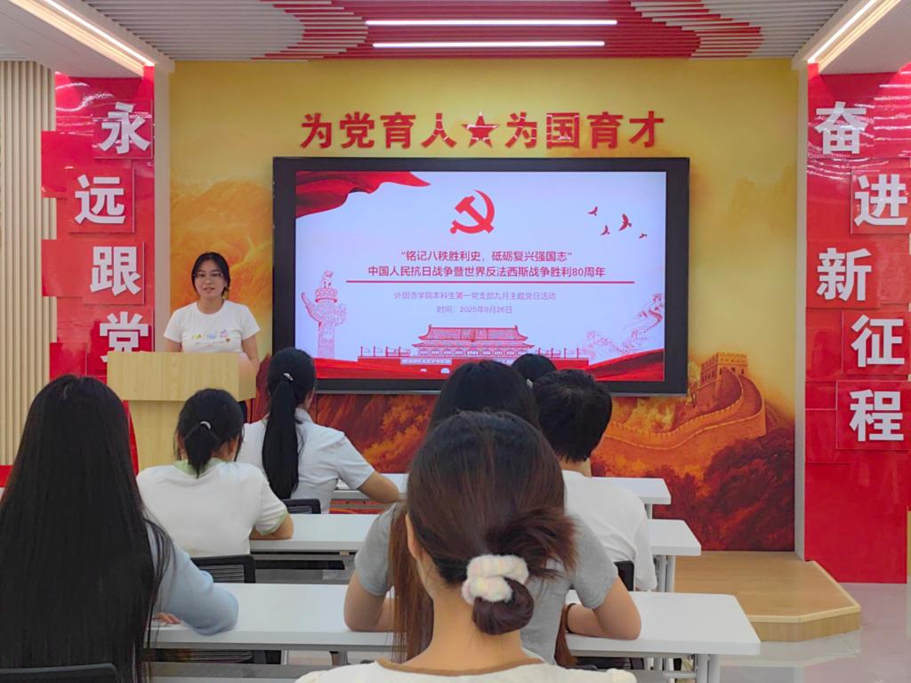 为深刻缅怀抗战历史,强化党员国家安全意识,增强维护国家安全的责任感与使命感,2025年9月26日,我院本科生第一党支部在4B思政大讲堂组织开展“中国人民抗日战争暨世界反法西斯战争胜利80周年”九月主题党日活动。活动由支部书记邓洁琼同志主持,支部27名党员及16名入党积极分子共同参与。