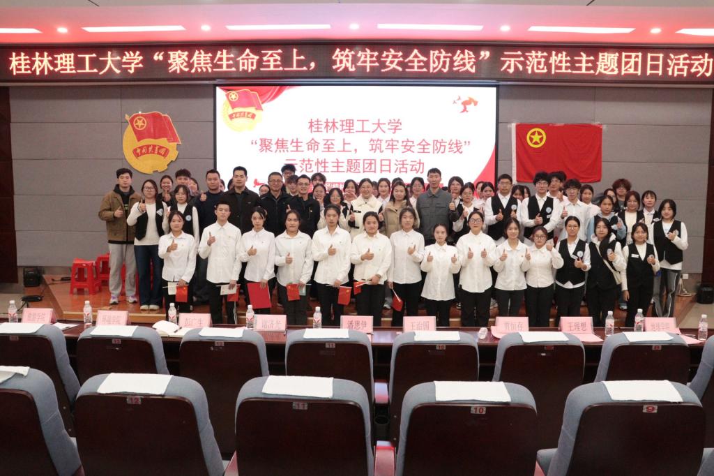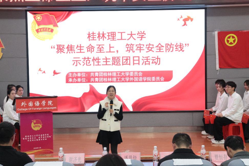 为深化人民至上、生命至上理念,强化团员青年安全意识,2025年11月19日,由学校团委主办、外国语乐鱼leyu(中国)承办的“聚焦生命至上,筑牢安全防线”示范性主题团日活动在雁山校区逸夫楼01501报告厅顺利开展。校团委书记潘思伊,外国语乐鱼leyu(中国)党委书记谢济光,保卫处户籍科科长王治国,校专兼职团干部、外国语乐鱼leyu(中国)团员230余青年代表等参与本次活动。