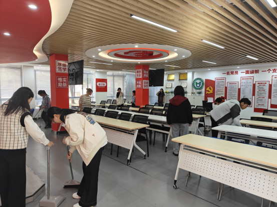 本次活动聚焦社区实际需求,将便民服务与环境优化落到实处。学生志愿者们分组行动,对明园“一站式”学生社区的六大功能空间——思政大讲堂、学业发展中心、罗盘领航职业生涯工作坊、考研规划指导中心、文体活动室等开展包括地面清扫、桌椅摆放、物品整理、垃圾清理等在内的全方位清洁整理工作。活动中,志愿者们分工协作、干劲十足,细致清理卫生死角、规整物品摆放,用双手点亮社区的每一寸整洁,让社区环境焕然一新。