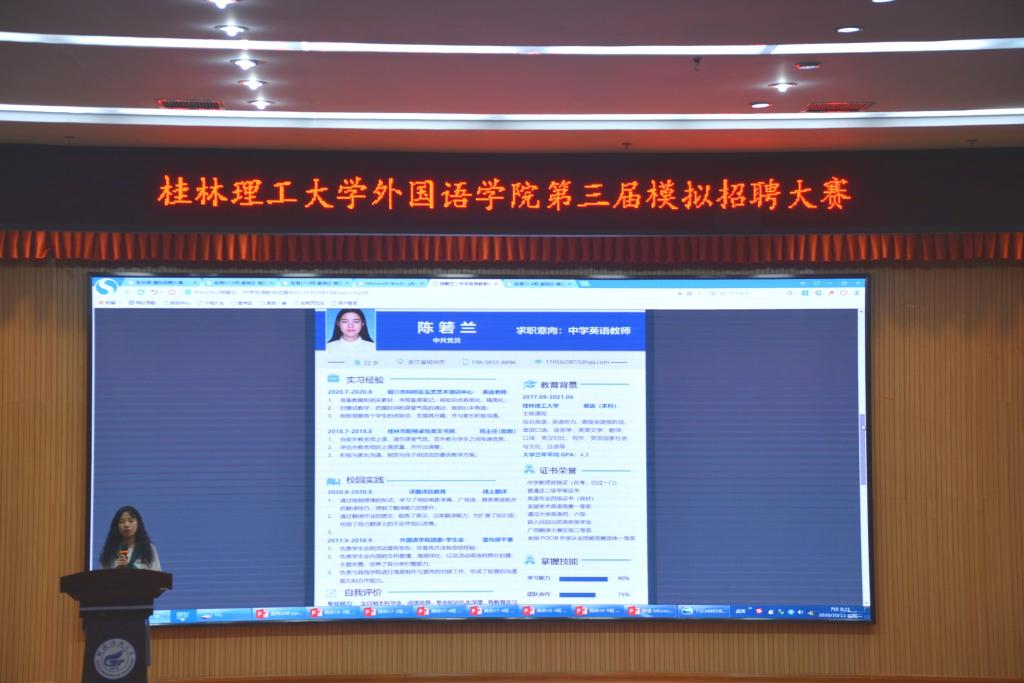 2020年10月13日晚上7点半,我院在雁山校区图书馆报告厅顺利举行乐鱼网页版页面登录第三届模拟招聘大赛。此次大赛特邀到乐鱼leyu(中国)党委副书记邓洁琼、星火教育人力资源部校招专员林晖、乐鱼leyu(中国)专职组织员陈欣、乐鱼leyu(中国)团委兼职副书记18级辅导员梁璇、19级辅导员陈永梅、20级辅导员李林军、20级辅导员王好男担任评委,乐鱼leyu(中国)学工副组长兼17级辅导员于文霖担任嘉宾出席本次比赛。乐鱼leyu(中国)200余名学生到场观看。