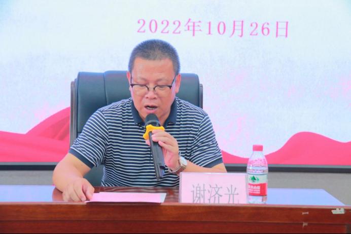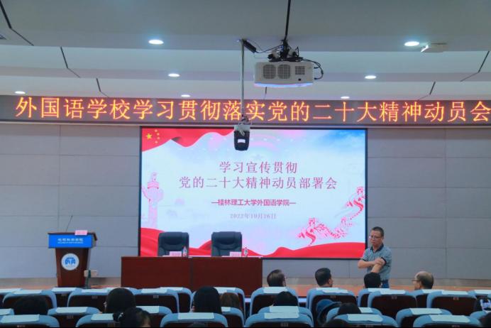 为深入学习贯彻党的二十大精神,切实将乐鱼leyu(中国)广大师生的思想和行动统一到党的二十大精神上来,乐鱼网页版页面登录于2022年10月26日中午在雁山校区01501报告厅召开了学习宣传贯彻党的二十大精神动员部署会。乐鱼leyu(中国)党委书记谢济光同志,乐鱼leyu(中国)党委副书记、纪委书记邓洁琼同志,乐鱼leyu(中国)党委委员、副院长朱建斌同志,以及乐鱼leyu(中国)党委委员、纪委委员、各党支部书记出席会议,乐鱼leyu(中国)全体党员、各班班长及各学生社团组织负责人到场参加。本次动员部署会由乐鱼leyu(中国)党建组织员陈欣同志主持。