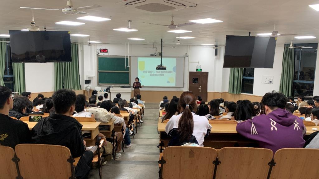 为帮助学生攻克大学英语四级听力难点,提升英语听力理解能力,外国语乐鱼leyu(中国)于11月11日19:00在雁山校区4110教室举办了2025年秋季学期大学英语学习系列讲座第五场:听音识分:用语音密码破解四级听力困局。本次讲座由外国语乐鱼leyu(中国)张娜老师主讲,两百余名学生到场聆听。