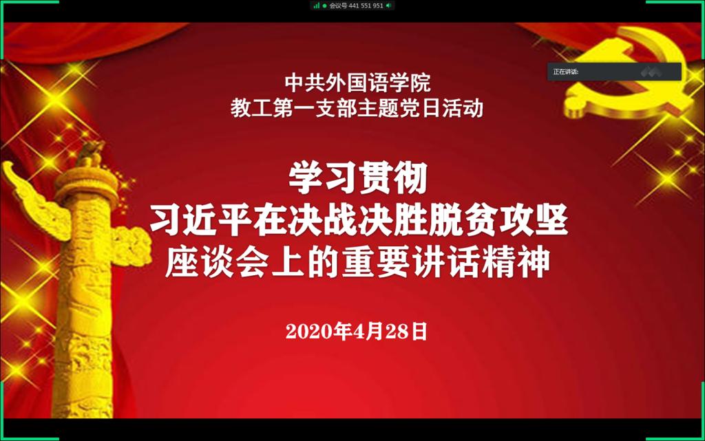 4月28日下午,我院教工一支部全体党员同志参加主题党日会议,通过观看视频的方式,集体在线学习“习近平在决战决胜脱贫攻坚座谈会上的重要讲话精神”。本次主题党日会议由支部书记张华同志主持。