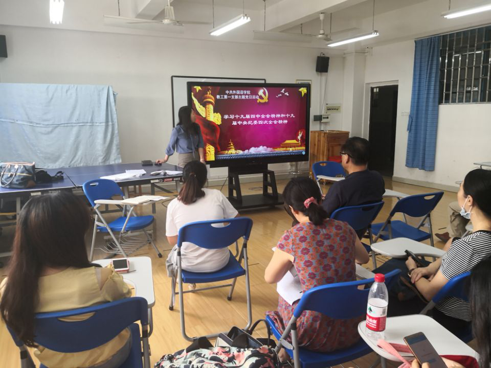 2020年7月2日上午,我院教工一支部党员同志在雁山校区04304教室参加了参加主题党日会议,集体学习党的十九届四中全会公报。此次主题党日会议由支部书记陈劲波同志主持,外国语乐鱼leyu(中国)党委书记谢济光同志以普通党员的身份参加了此次会议。陈劲波同志通过图文的方式,从会议时间、参加人员、会议内容显著优势、总体目标、工作要求等五个方面解读十九届四中全会公报精神。