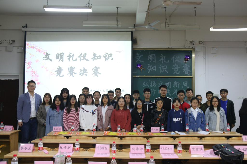 11月27日晚,我院在我校雁山校区6栋教学楼06105教室举办文明礼仪知识竞赛决赛。我院团委书记钟立军,团委副书记金颖洁、黄媚,学生会主席杨海洁,学生会副主席贾雪琪,希望联盟社长黎冬兰以及各公益社团代表和嘉宾出席本次比赛。